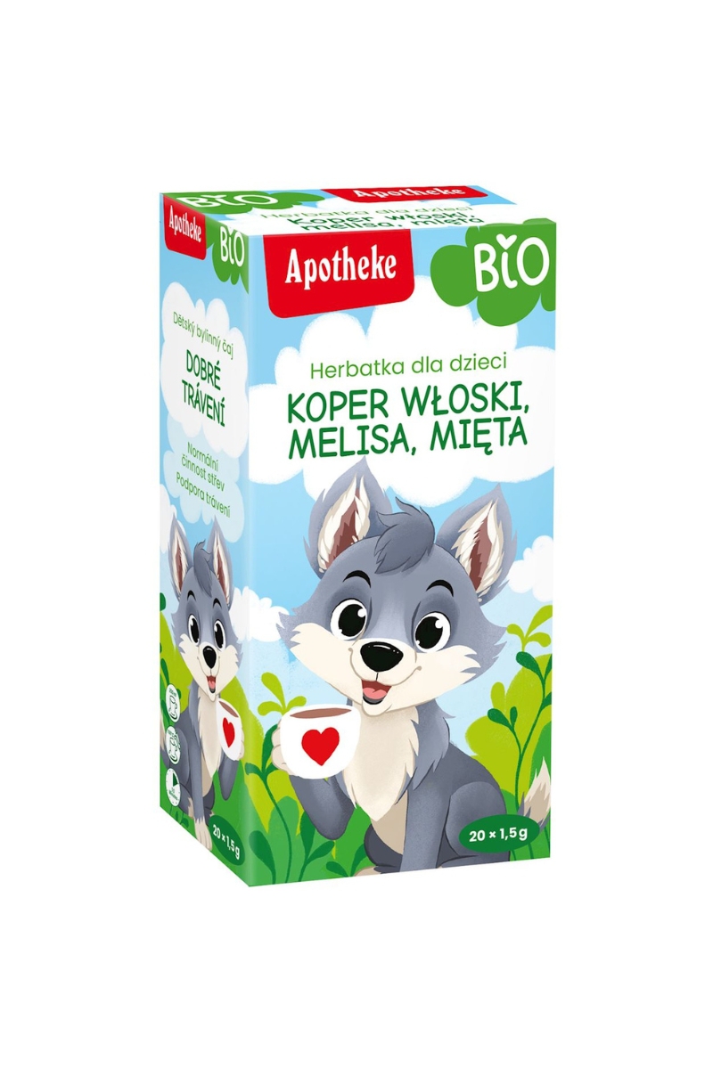 bio owoc kopru włoskiego (Fructus Foeniculi) 25%, bio ziele melisy (Herba Melissae) 20%, bio liść mięty pieprzowej (Herba Menthae Pepetitae) 20%, bio liść maliny (Folium Rubi Idaei), bio kwiatostan lipy (Flos Tiliae), bio owoc kminku (Fructus Carvi).